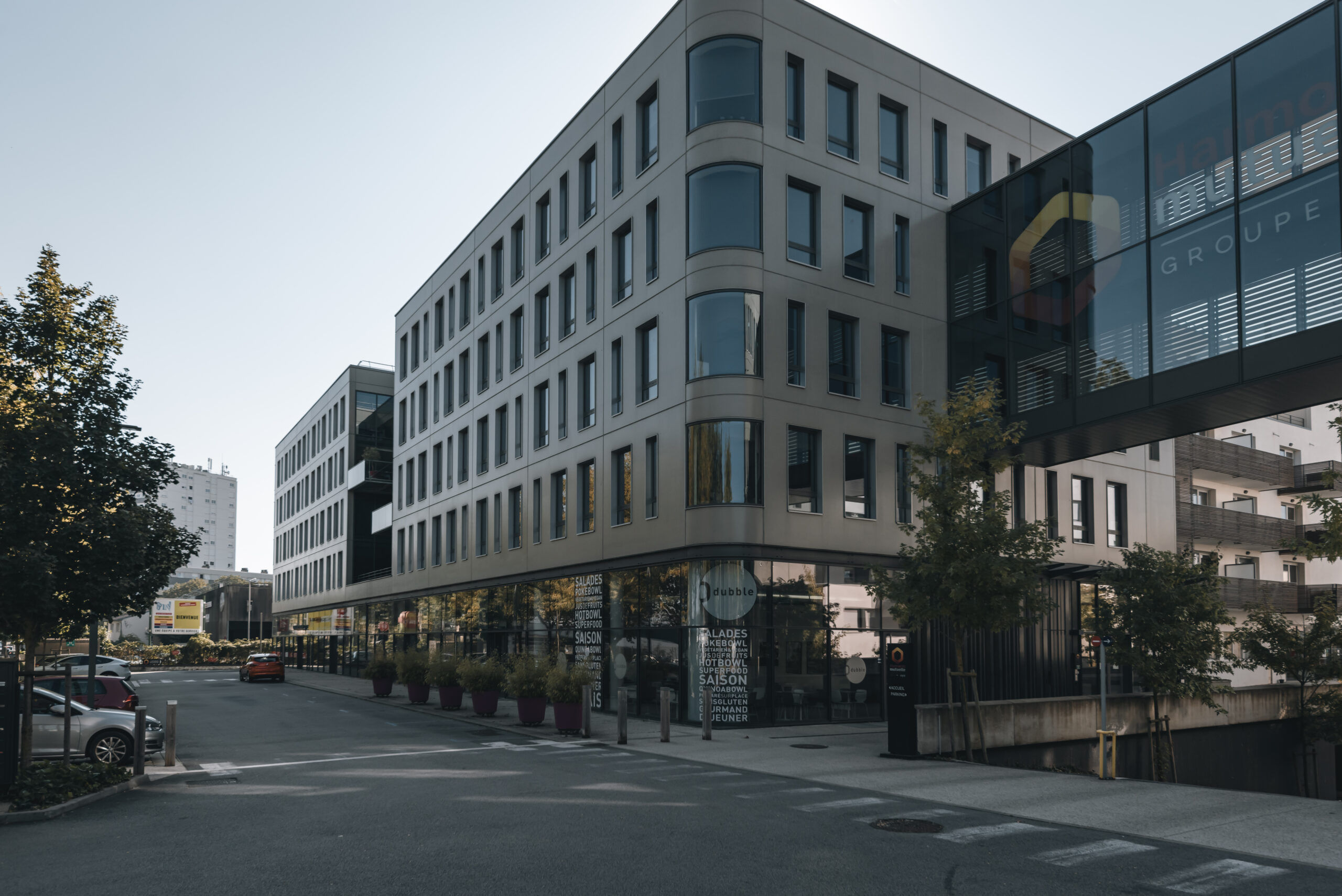SODEL a accompagné la construction de deux bâtiments interconnectés par une passerelle aux étages, intégrant des cellules commerciales au